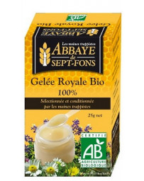 Abbaye de sept fons Gelée Royale Bio non congelée 25 gr apporte de la gelée royale pure en pot. 25 doses de 1000mg pour 25 jours de cure revitalisante.
