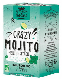 Romon Nature Infusion Crazy Mojito menthe citron bio 16 sachets apporte sous forme de tisane bio, le fameux cocktail Mojito sans l'alcool. Pour les passionnés et les fous de Mojito, à consommer chaud ou froid selon la saison.