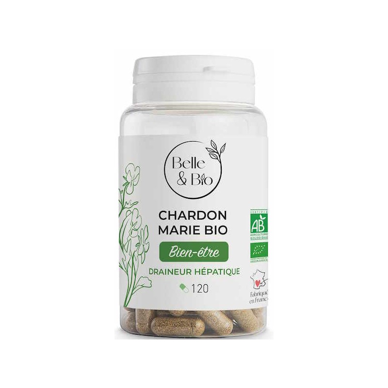 Belle et Bio Chardon marie bio 120 gélules procure la semence de Chardon marie (Silybum marianum) avec 1200mg de Poudre biologique de chardon marie fruit pour 4 gélules.